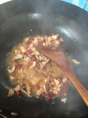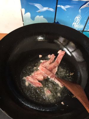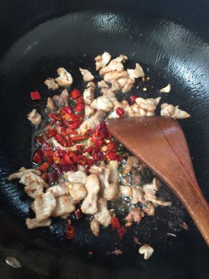 继续烧至3-4成热(100-120度左右),放入腌好的里脊肉丝,滑炒至肉熟。