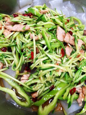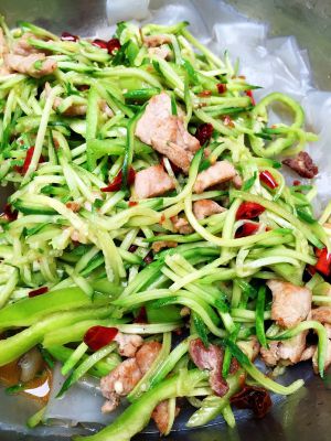 热锅凉油,将里脊肉入锅大火炒至变色,加少许料酒,酱油,翻炒均匀,倒入黄瓜丝,翻炒至断生,出锅,倒在拉皮上面.