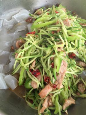 黄瓜洗净切丝.里脊肉切丝.新鲜拉皮切宽条,用开水烫洗一下,倒掉水份备用.