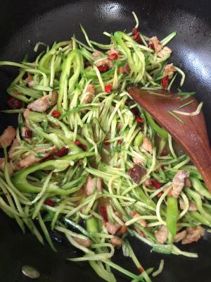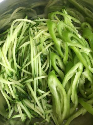 加黄瓜丝辣椒丝,快速翻炒,加盐,味精