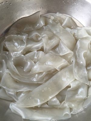 买回来的拉皮用凉开水过一下捞出控水。这个拉皮其实和凉皮差不多。东北拉皮原以马铃薯淀粉或绿豆淀粉制作,但现在多以木薯淀粉为原料制作。