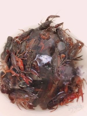 第二步:清洗 先稍微清水洗一下,然后清水里加白醋,食盐,把小龙虾泡在里面,也可加几滴食用油,浸泡二十分钟左右,目的是让它把身体里的污物吐一吐。