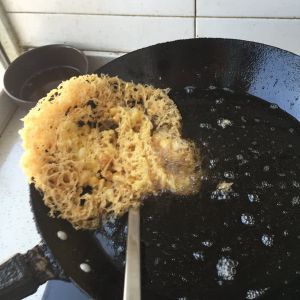 漏勺捞出,要转着圈捞出,这样才是圆形,好看。漏勺越大越有型。
