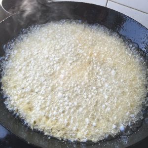 锅中加油烧至4成热(油多些),手握细眼筛子对准油锅,四面均匀的淋入打匀的蛋液,使之逐渐淋入油中受热成丝并浮起时,用筷把它翻过来,略松一下捞出,放在小箩中尽量压干油份。