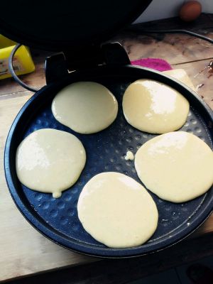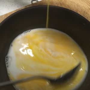 平底锅烧热后,用小勺子挖起蛋糊放入锅中,用小火煎至底部定型