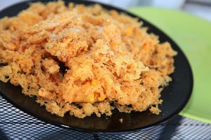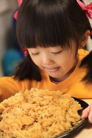 用干净的包装纸放入压干的蛋丝,卷起,轻轻的推搓,纸潮即换纸,反复3-4次,使蛋丝成为干而膨松的蛋松即可。