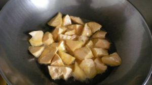 地瓜削皮切块入油锅炸成金黄色