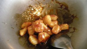 迅速将熟地瓜放入锅中翻炒,待糖将地瓜翻炒均匀