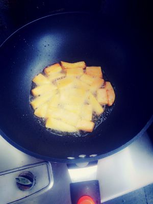 锅中倒油,小火,凉油放入地瓜快,慢慢炸至金黄,硬脆,捞出控油,备用。(炸制过程中小心不要被烫到哟)