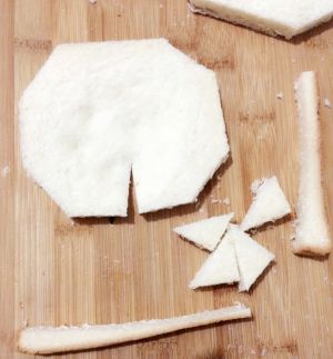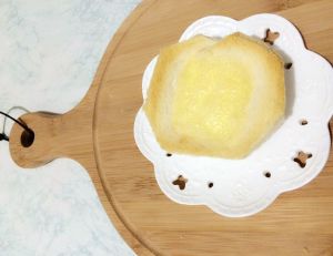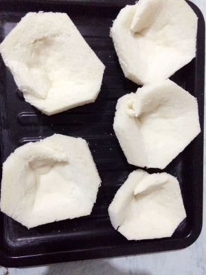 土司片切去四边和四角,一侧切小口,毛刷蘸清水,弹少许清水在土司片上,为了防止它因干燥开裂,用手掌按压土司片并将它折成小碗状,小口的连接处压紧,不要弄破,防止蛋液流出。
