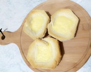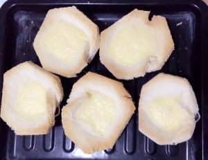 做好的土司碗是这样的,放入蛋挞模里,倒入蛋液,8分满。