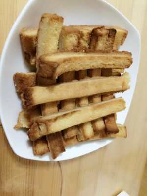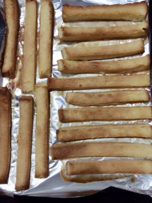 还略剩了些蛋液,不能浪费,切下的土司边沿,四面蘸上蛋液,摆放于烤盘中,130度15分钟。