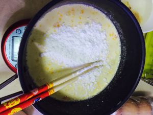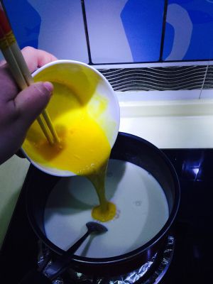 牛奶放凉后加入打好的鸡蛋黄,继续搅拌均匀