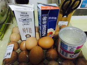 准备牛奶、淡奶油、鸡蛋、炼乳