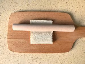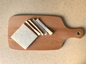 蛋糕模具刷玉米油,防止粘上,把面包片放入模具里。