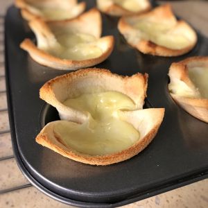 烤盘铺一层油纸(也可不放,我是为防止蛋挞底烤焦),将塔皮放在烤盘上,倒入蛋挞水。