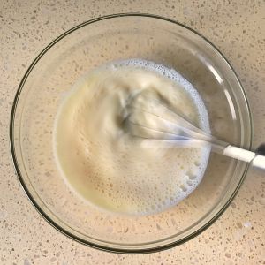 关火再加入牛奶,再加入打好的蛋黄,搅匀。