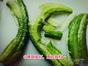 用刀拍扁它,切成段放碗里,加入细盐抓匀静置10分钟左右,倒掉控出的水;