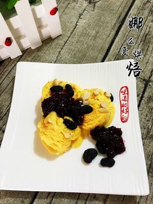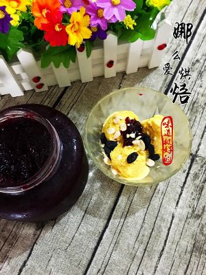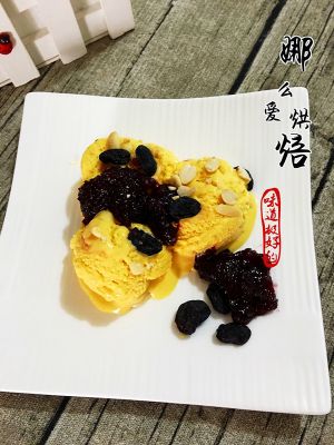冷藏好的奶油加入剩下的砂糖打至6/7分发,加入蛋液,拌均!倒入大点的盒子里,放冰箱冷冻,之后每隔一小时,用打蛋器打搅打!最少打5次!美味的冰淇淋就做好了,加入自己喜欢的干果和果酱,我放的是自制的杨梅酱,酸酸甜甜很好吃!