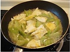 不加油,炒鸡蛋剩余油,炒丝瓜,加开水,直到丝瓜吵到半透明变软