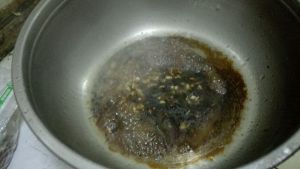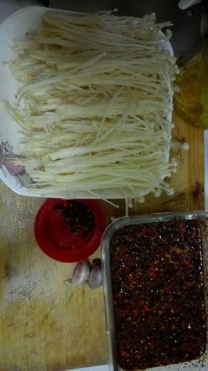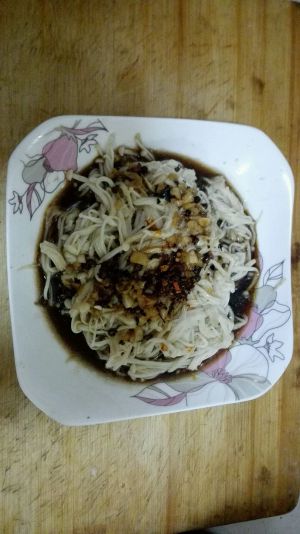 调汁 热锅倒油,放入花椒大蒜炸香,倒入醋和酱油,最后将翻滚的热汁浇金针菇上