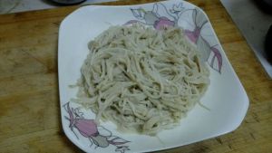 金针菇已经变成软软的啦。捞起来,沥干,装盘。