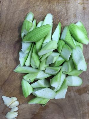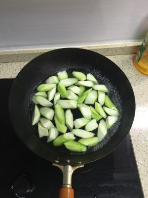 锅里再加入油烧热,加入丝瓜,少许糖翻炒至变透明软。
