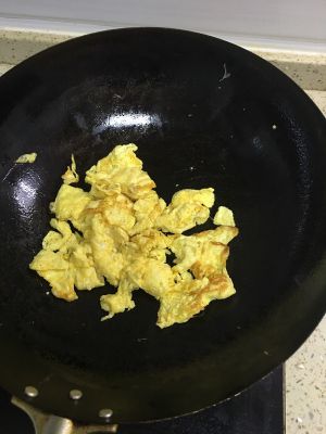 倒入打好的鸡蛋翻炒至七成熟盛出备用。