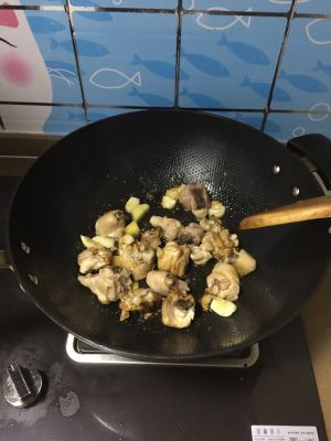 将鸡块倒入炒好糖色的锅里翻炒,使鸡块都均匀染色。