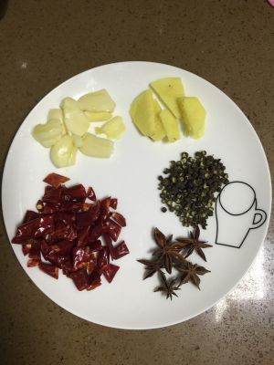 蒜瓣切片、姜切片、准备干辣椒、八角、麻椒。还有冰糖7、8块。