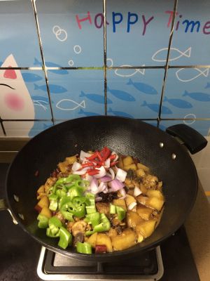 焖15分钟后,汤汁已经不多了,倒入尖椒、朝天椒、洋葱大火翻炒两分钟左右。(此时土豆已经焖的很面了,完全入味了。如果要下面就多留点汤)