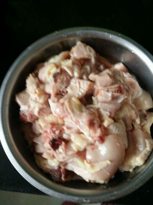 凉水下水煮,加入葱,姜,桂皮,香叶等,目的是去除鸡肉里面的脏东西,水滚后将鸡块用凉水冲洗干净。