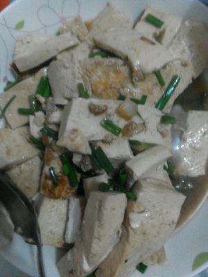 用葱姜爆锅,放进豆腐轻推,倒酱油,加水,加糖和盐,干贝素。收汁即可。
