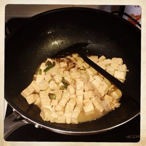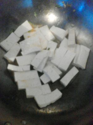 先下入配菜煸炒几下,再把豆腐一起放入,加盐、鸡精、耗油、白糖和适量清水继续煸炒