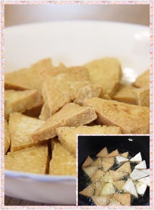 把豆腐切成三角下油锅炸至两面金黄 沥油备用