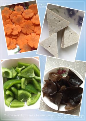 1.豆腐切块儿,三角或方形皆可; 2.胡萝卜花刀切片 3.青椒切成小块儿; 4.木耳发好后切片。