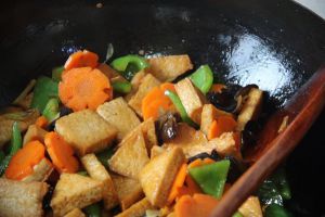 1.放入煎好的豆腐,与蔬菜一起翻炒; 2.放入适量糖,生抽; 3.锅中加适量清水,中火炖两三分钟,使豆腐入味。 4.加入调好的水淀粉,大火勾芡。 起锅