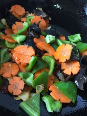 倒入切好的胡萝卜,青椒,木耳,大火爆炒至断生即可。