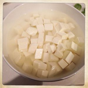 热锅入油,油热后放入豆腐,煎至豆腐呈金黄色捞出,将油沥干备用。