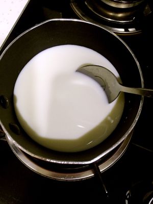 牛奶150g加入13g细砂糖加热至八成温度,不要煮开了。