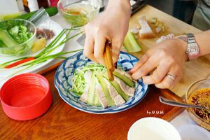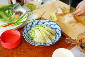 肉焖好后取出来,取一根黄瓜擦丝铺盘底,再切一些薄片,白肉切片