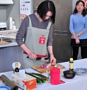用一片蒸热的肉片,卷入黄瓜丝,用竹签固定。