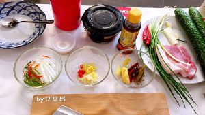 将切好的五花肉放入辣椒段,蒜泥,嫩姜丝中,加入腌好的黄瓜(黄瓜腌出的水不要),根据自己口味放入适量油辣子,花椒面,芝麻油,生抽,醋,葱花,拌匀即可。