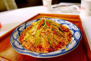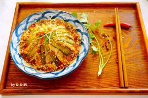 调料:蒜泥、葱花浇热油,激发香味,再加盐、胡椒粉、白糖、酱油、熟芝麻,搅拌均匀。