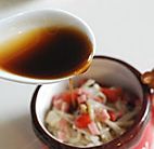 倒入2勺醋.生抽。1/3勺盐。一点点鸡精。一勺麻油或辣椒油。