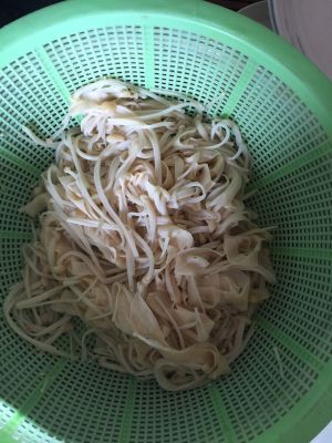 在准备材料的时候,你可以锅里放水,烧水~水开了把金针菇放入锅中过水半分钟…捞出…然后黑木耳过水2分钟捞出…放在菜盆里沥干水分,我家里还有点豆皮我也一起弄了~不浪费~没有的可以不放~