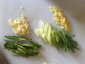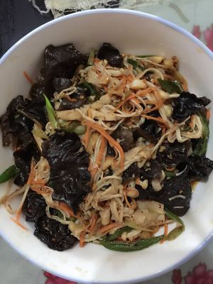 黑木耳泡开手撕成小朵,金针菇洗干净撕开,胡萝卜切成丝(我是酥的,普通话不知道怎么说)葱切斜刀,蒜切碎,姜(不喜欢的可以不放,我家喜欢吃姜的味道,所以我切的很碎,有姜的味道,却吃不到姜)青辣椒切斜刀,没有青辣椒红辣椒也可以,不放也可以~
