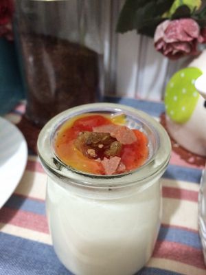 出锅后先撒点葡萄干和蔓越莓干,没有的小伙伴可以自己任意填加点自己爱吃的干果哦,不加也可以直接开吃。喜欢吃冰的小伙伴可以先放冰箱冷藏一会。