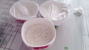 然后倒入小碗里,封上保鲜膜,盖上盖子,上火又蒸15分钟左右,蒸好之后不忙着揭开盖子,闷5分钟再打开,然后放凉