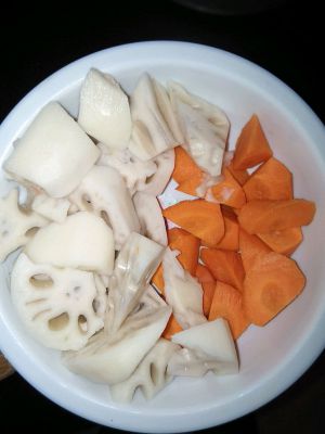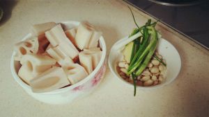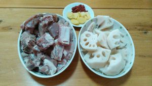 排骨洗净控干水份,莲藕洗净去皮切大块,生姜去皮切片,枸杞子洗净。